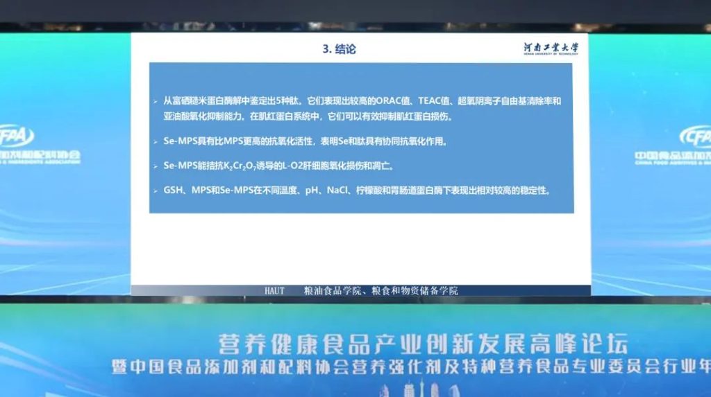 2023营养健康食品产业创新发展高峰论坛会圆满结束,本次峰会中,河南工业大学粮油食品学院院长刘昆仑教授和河南希百康健康产业有限公司副总经理王阳分别对有机硒的作用机理、功效及硒与糙米活性肽协同作用下缓解肝细胞氧化损伤的机理进行了介绍说明。