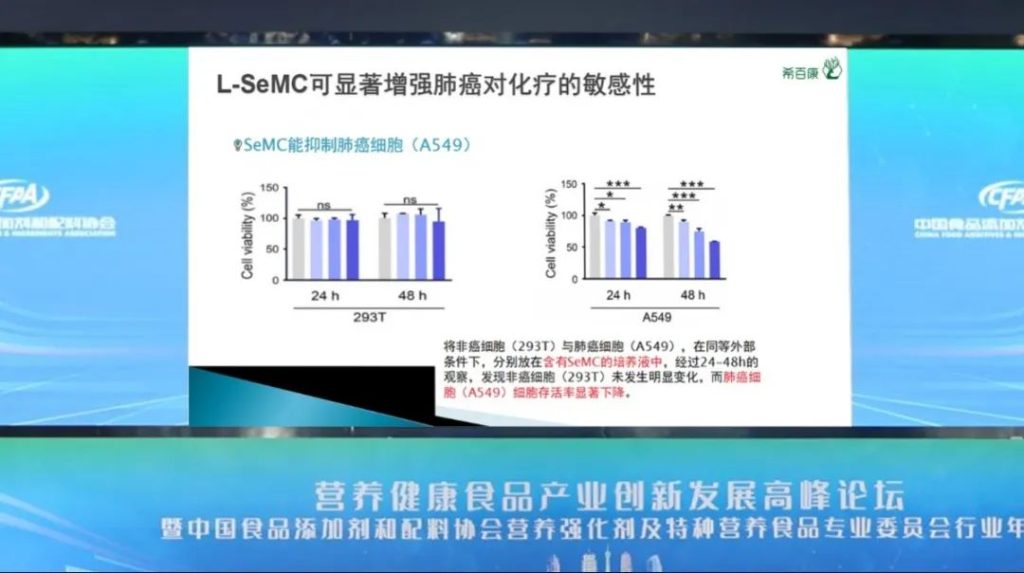 研究数据表明,L-硒-甲基硒代半胱氨酸可显著增强肺癌对化疗的敏感性,其与化疗药物的联合应用可减少癌症治疗所需的药物剂量,降低甚至避免潜在的副作用,L-硒-甲基硒代半胱氨酸联合化疗药物的治疗策略在肿瘤治疗中具有巨大的潜力。