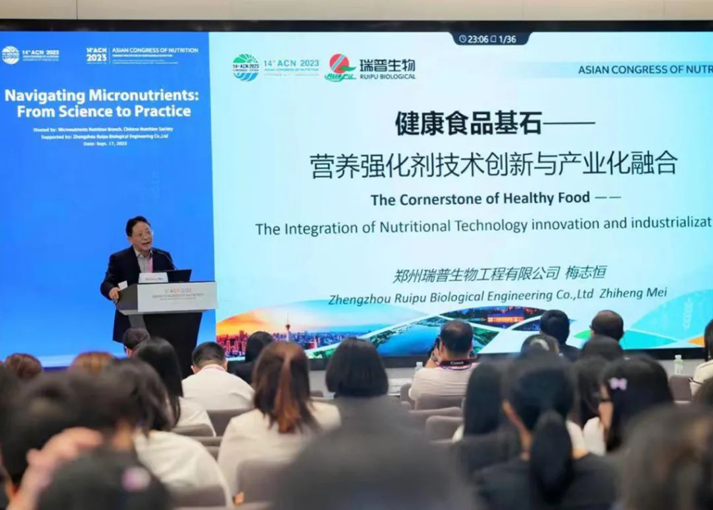 分论坛会场郑州710公海线路检测生物工程有限公司董事长梅志恒应邀分享“健康食品基石-营养强化剂技术及产业”的主题报告。